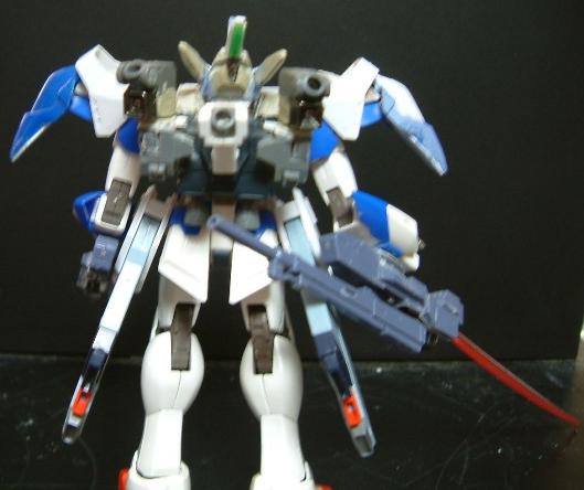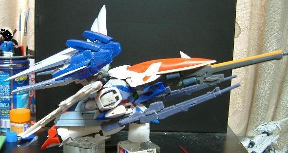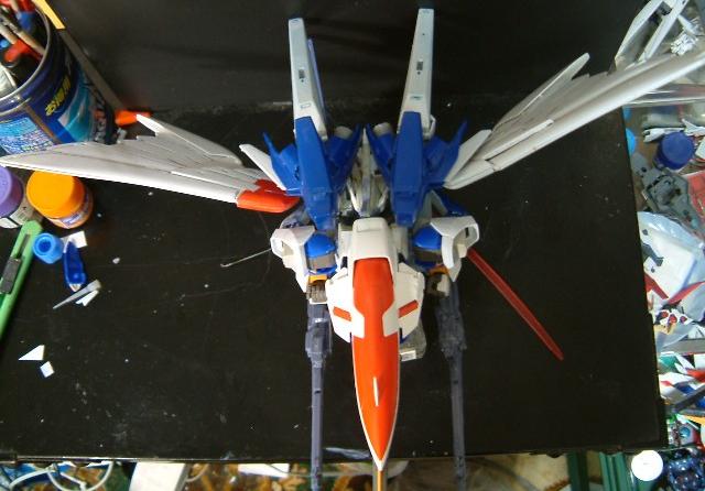 新しい肩アーマーはフリーダムの足首、デ○サイズの足の甲を乗せてから、テール部分にはゼロ○スタムの腰アーマーをつけています。これがマルチブースターです(汗)